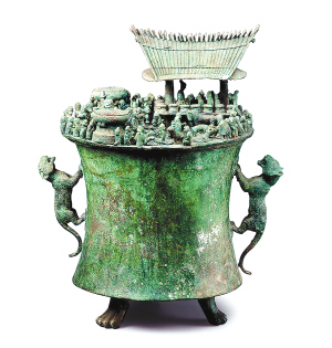 国宝档案:西汉(公元前206~公元25年)。高53厘米器盖直径32厘米。1956年云南晋宁石寨山出土。