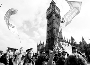 | 3月28日,在英国伦敦,游行队伍经过英议会大厦。 新华社记者张礼庆摄 |