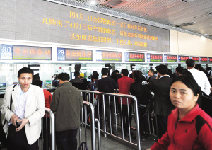 3月31日,旅客在广州火车站售票大厅购票。大厅电子屏幕提醒旅客4月1日后,按照新列车运行图的时刻乘车。 4月1日零时起,全国铁路将实施新的列车运行图,这是继2007年4月18日第六次大面积提速调图之后,铁道部再次对列车运行图进行较大范围的调整。目前,各项准备工作已经就绪。调整后,我国铁路客运能力将提高10.6%以上,部分城市之间的列车运行时间大幅压缩,最长节省时间在14小时以上。 铁路部门提醒说,4月1日前后是新旧运行图交替阶段,请广大旅客注意车站的列车变化公告。 新华社记者 陈晔华 摄