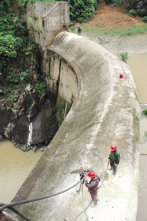 3月31日,工作人员在广东省英德市波罗坑一级电站大坝坝顶钻炮眼,准备安装炸药。 波罗坑一级电站水库蓄水量为20多万立方米,大坝坝高30.5米,为浆砌石拱坝。日前,水利部门在开展汛前水利工程安全检查时,发现大坝坝体下游面中下部的浆砌石出现长约12米、宽约7米、深约2米的剥落,属结构性破坏,存在重大安全隐患。目前,大坝险情已得到初步控制,大坝将在近期实施爆破拆除。 新华社发