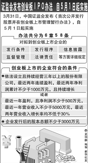 据新华社北京3月31日电 (记者赵晓辉、陶俊洁)中国证监会31日发布《首次公开发行股票并在创业板上市管理暂行办法》,办法自5月1日起实施。这意味着筹备十余年之久的创业板有望于5月1日起正式开启。