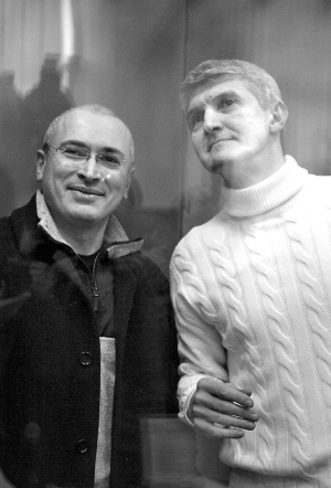 3月31日,俄罗斯前首富,尤科斯石油公司前总裁米哈伊尔·霍多尔科夫斯基(左)及其合伙人普拉东·列别杰夫在俄罗斯首都莫斯科出庭时站在防弹玻璃后面。日前,俄罗斯检方对霍多尔科夫斯基及其合伙人列别杰夫提出新指控。 新华社/法新