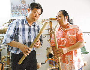 3月31日,我国著名竹乐专家、北京竹乐团团长王巍南下保亭黎族苗族自治县,探访黎族竹木器传承人黄照安,了解黎族竹乐器的历史、现状和制作等情况。 图为王巍(左)与黄照安一起演奏黎族乐器。 特约记者 黄青文 摄