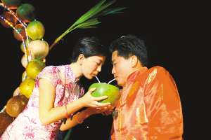 当晚,参加“最牛夫妻”评选的幸福夫妻们聚集在沙滩上,成了这场特殊婚礼的亲友团。闪闪星光下,组成心型的青椰上挂着大大的红双喜,常新成和马凤一起品尝甘甜的椰汁,露出幸福的微笑。