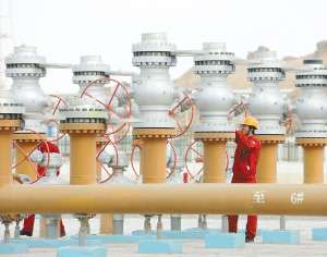 3月31日,中国石油塔里木油田克拉2气田中央处理厂的工人在进行清洁作业。 新疆各油田企业的最新统计数据显示,2008年新疆总油气当量达到4797万吨,连续两年居全国第一。 新华社发