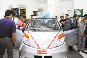 4月1日,在印度首都新德里的一个汽车展厅,塔塔NANO微型轿车吸引了众多参观者的目光。印度塔塔集团出品的NANO微型轿车日前正式上市。这款小车售价不足2000美元,堪称世界最廉价轿车。 新华社/法新
