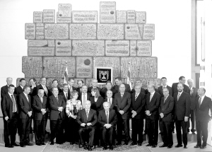 | 4月1日,在位于耶路撒冷的以色列总统佩雷斯的府邸,佩雷斯(前右)与新上任的以总理内塔尼亚胡(前左)以及新一届政府成员合影。 新华社/法新 |