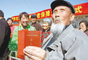 河北黄骅 60岁以上农民领养老金 4月1日,在河北省黄骅市滕庄子乡西胡庄村,92岁的胡学甲老人领到农村基本养老保障金领取证和养老保障金存折。 今年年初,黄骅市推出农村基本养老保障制度,采取个人缴费和政府补贴的办法,年龄在45岁及以上的农民可通过一次性交纳数额不等的参保金加入农村基本养老保障,并从60岁开始每月领取养老金,80岁以上老人不用交纳参保金可直接领取养老金。 新华社发(傅新春 摄)