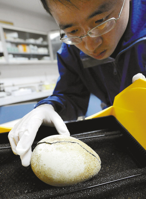 4月1日晚,在经过近50天的企鹅孵化和最后几天的人工孵化后,南京海底世界的一枚帝企鹅蛋开裂,技术人员发现,这枚帝企鹅蛋不是受精卵,未能孵化出帝企鹅“宝宝”。 这枚珍稀的帝企鹅蛋是2009年2月由南京海底世界的帝企鹅在人工养殖环境下所产。据悉,这枚帝企鹅蛋将被制作成标本,向游客展出。 新华社记者 孙参 摄