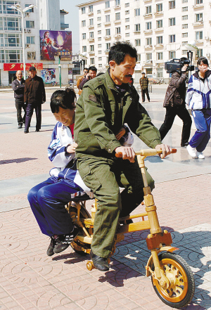 4月2日,孙立学载着一名中学生,试骑木制自行车。 今年52岁的辽宁省铁岭市清河区货郎屯农民孙立学,经过3个月的研制,制作出一辆除轴承、轮胎等零件外,大部分由木头做成的自行车。车高95厘米,重量16公斤,可承载近200斤的重量。 新华社发