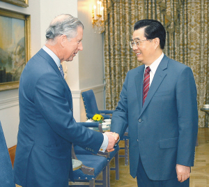 | 四月二日,国家主席胡锦涛在伦敦出席二十国集团领导人第二次金融峰会期间会见英国王储查尔斯王子。 新华社发 |