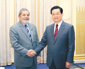 | 四月二日,国家主席胡锦涛在伦敦出席二十国集团领导人第二次金融峰会期间会见巴西总统卢拉。 新华社发 |