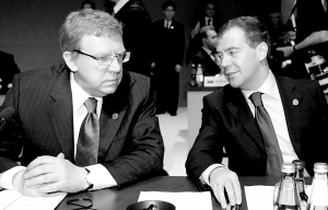 俄罗斯总统梅德韦杰夫(右)与副总理兼财政部长库德林。