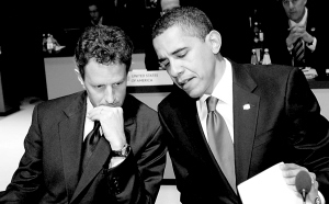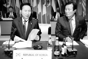 韩国总统李明博(左)与企划财政部长官尹增铉。