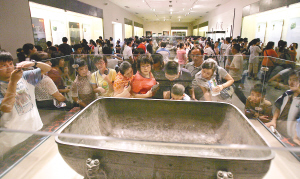| 4月4日,国宝展迎来开展后的首个节假日,市民涌进省博物馆争睹国宝风采。 本报记者 林萌 摄 |