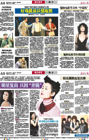 2009年的娱乐圈,很流行一句话———“我又回来了”。陈冠希、阿娇一直在寻找复出的良机,林青霞复出大计酝酿了很久,现在连钟楚红、王菲和张柏芝都加入这支再就业大军了。和老公家底厚、复出只为兴致的林青霞不同,好多人是为了钱复出。