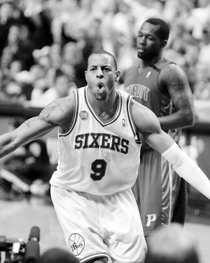 ← 4月5日,NBA常规赛中,费城76人队主场以95比90战胜底特律活塞队。成为本赛季第五支提前锁定季后赛席位的东部球队。 图为76人队球员伊古达拉在得分后庆祝。 新华社发