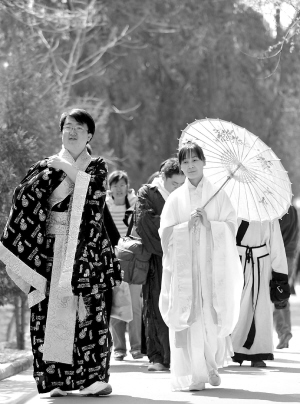 4月5日,传统文化爱好者穿着汉服在兰州白塔山公园踏青游玩。 新华社记者 聂建江 摄