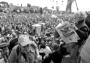 4月4日,在意大利罗马竞技场旁的奇尔科·马西莫广场,人们参加意大利总工会组织的示威活动。数十万意大利人当日在罗马举行示威活动,抗议政府处理金融危机的方式并要求政府在创造新工作岗位上加大投入。 新华社/路透