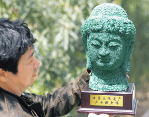 4月6日,洛阳群众艺术馆的李明甫展示他用火柴拼塑的一尊龙门石窟卢舍那大佛头像。这尊卢舍那头像高32厘米,李明甫先用石膏建模,然后用白乳胶将火柴一根根粘起来,用了近3万根火柴,耗时2个月。此前他曾经创作过三彩、青铜等材质的卢舍那头像雕塑。