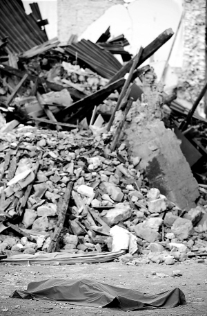 | ↑一名遇难者尸体被放在一座房屋的废墟旁。 |