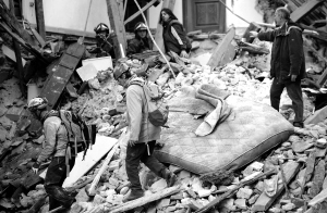 | ↑救援人员在废墟里搜救。 |