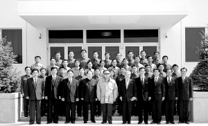 | 朝鲜最高领导人金正日(前左五)5日在卫星控制综合指挥所与工作人员合影。