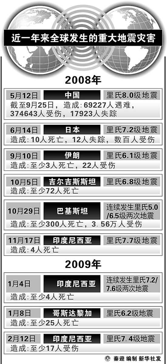 ■1905年9月8日,意卡拉布里亚地区发生里氏7.9级地震,造成大约5000人死亡。 ■1908年12月28日,意西西里岛默西拿海峡发生里氏7.5级地震并引发海啸,造成12.3万人死亡。 ■1915年1月13日,意首都罗马以东阿韦扎诺发生里氏7.0级地震,造成约3万人死亡。 ■1930年7月27日,意南部伊尔皮尼亚地区发生里氏6.5级地震,造成约1400人死亡。 ■1976年5月6日,意东北部弗留利地�