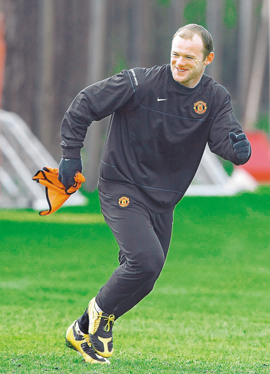 4月6日,曼联队在卡林顿训练基地进行训练,备战4月7日和波尔图队的欧冠四分之一决赛首回合的比赛。图为鲁尼在训练中。 新华社发