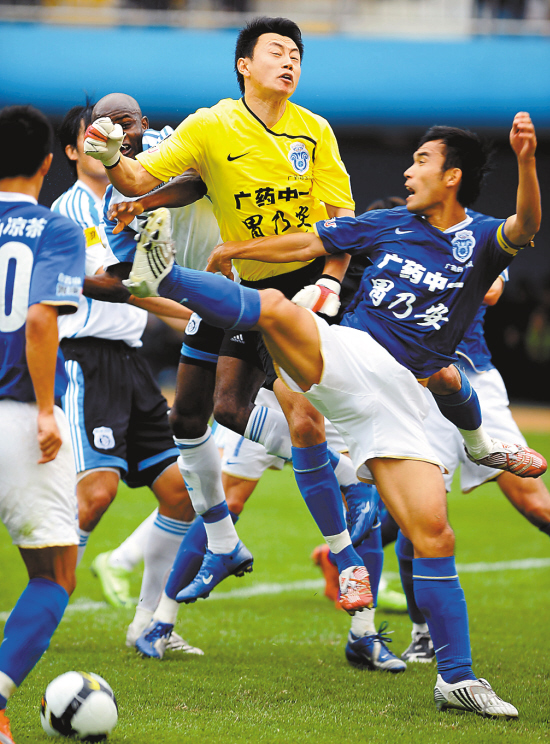4月6日,在中超联赛第三轮比赛中,广州队主场以3:1战胜大连队。图为双方球员门前拼抢。 新华社发