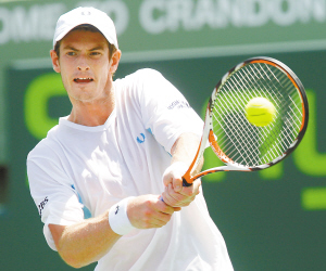 5日,英国选手穆雷在比赛中回球。当日,在美国迈阿密进行的索尼爱立信网球公开赛男单决赛中,穆雷以2比0战胜塞尔维亚选手小德,获得冠军。 新华社