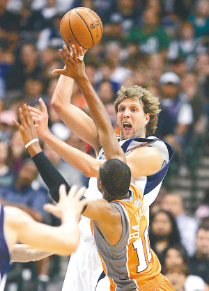 6日,小牛队在NBA常规赛中主场以140:116战胜太阳队。图为小牛队队员诺维斯基(上)在比赛中传球。 新华社发