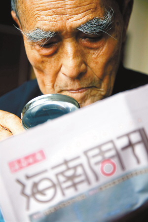 | 在纪念海南南侨机工回国抗日七十周年大会上,九十一岁的海南南侨机工吴惠民用放大镜阅读《海南周刊》。