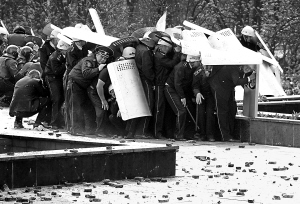 4月7日,在摩尔多瓦首都基希讷乌,警察躲避示威者投掷的石块。由于对议会选举结果不满,摩尔多瓦共产党人党的反对者7日举行示威抗议,并冲击摩总统府和议会大楼。 新华社/路透