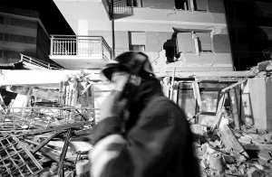 | 4月7日凌晨,一名救援人员在地震灾区拉奎拉市一幢倒塌的房屋前搜救。 新华社记者武巍摄 |