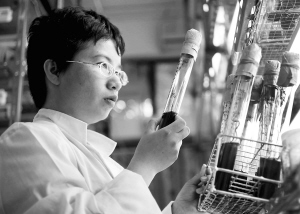 中国热带农业科学院橡胶研究所经过8年的努力,现已初步建立了橡胶转基因遗传转化体系,获得了数珠橡胶转基因植株。图为4月1日黄天带博士在观察橡胶转基因种苗的生长变化。 本报记者 苏晓杰 摄