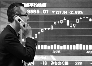 4月8日,在日本东京,一名男子从显示当日股价的电子显示屏前经过。新华社/法新