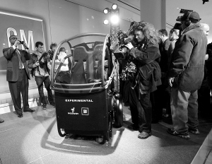 4月7日,媒体记者在美国纽约举行的双轮汽车发布会上拍摄样车。美国通用汽车公司当天宣布将与美电动车生产商赛格威公司联合研发一种双轮双座电动汽车。这种汽车占地小、价格低,能够自动行驶并避免事故和交通拥堵。通用计划最晚于2012年推出这款新车。 新华社/路透