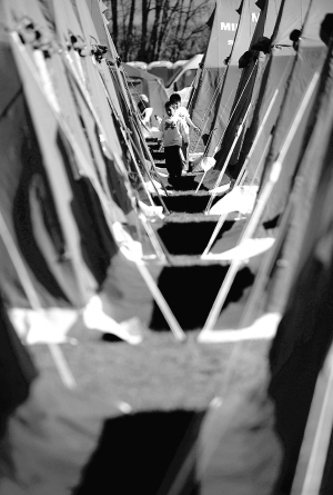 4月8日,在意大利中部城市拉奎拉,两名儿童在地震后临时搭建的救灾帐篷中间玩耍。据意大利民防部门当天公布的最新统计数字,意大利中部地震中的遇难人数已升至260人。 新华社/法新