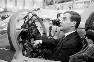 | 资料图片:2月20日,在位于俄罗斯伊尔库茨克州的俄主要飞机制造商之一伊尔库特公司,俄总统梅德韦杰夫在一架战斗机的驾驶舱内参观。新华社/路透 |