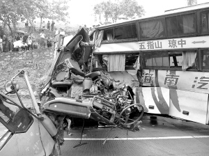 据客车乘客王家宝说,他们准备坐长途汽车从琼中出发往汕头打工,当时正躺在车上闭着眼睛休息,突然感觉猛烈一震,身体不由自主地向前冲,车窗玻璃也破裂四溅,双脚被前面车椅挫伤,睁开眼睛看才知道汽车和一辆货车相撞了。