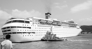 | “歌诗达经典”号邮轮首航抵达三亚。 本报记者 程范淦 摄 |