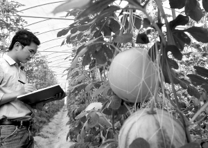 农业技术人员在钢制大棚里观察哈密瓜生长情况。三亚市大力发展设施农业,到目前为止,已经种植有3.5万亩的设施农业,农民从设施农业中得到的收益占农民纯收入的10%。 本报记者 程范淦 摄