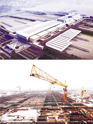 这是京沪高铁上海虹桥站设计效果图(上)与该站站台层施工全景。 近日,京沪高铁上海虹桥站“浮出地面”,即从地铁站厅、地下候车厅开始向地面站台层全面建设。京沪高铁上海虹桥枢纽工程计划2009年底初步建成,2010年世博会期间投入使用。 新华社发