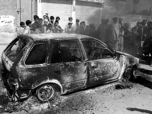 4月9日,在巴基斯坦西南部俾路支首府奎达市,人们在被焚毁的小汽车旁围观。据巴基斯坦媒体当日报道,巴西南部俾路支省3名地方政党领导人被杀害在当地引发骚乱。 新华社/路透 3名地方政党领导人被杀害 巴基斯坦俾路支省骚乱