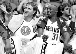 | 9日,在NBA常规赛中,小牛队主场以130:101战胜爵士队。图为小牛队球员诺维茨基(左)与队友特里在板凳席上喜笑颜开。 新华社发 |
