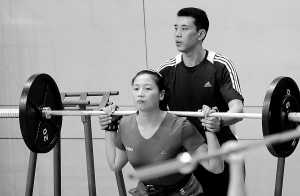 | 4月9日,新一届中国国家女子排球队在湖南郴州体育训练基地进行了首场体能训练。图为中国女排队员魏秋月(下)在教练帮助下利用杠铃进行力量训练。 新华社发