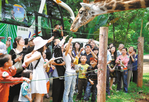 | 4月11日,“2009全国百城旅游宣传周”暨海南人游海南活动在海口、三亚、儋州三城市同时启动。图为启动仪式后海口市旅游局组织的首批100多名海南本地游客在海南热带野生动植物园里与长颈鹿亲密接触。 本报记者 王凯 摄 |