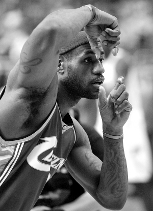 | 4月10日,在NBA常规赛中,骑士队詹姆斯在比赛前与队友摆出拍照姿势。 新华社发