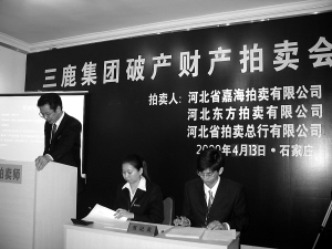 4月13日,石家庄三鹿集团股份有限公司第四批破产财产拍卖标的在河北省嘉海拍卖有限公司拍卖会上遭遇冷场,无人举牌竞拍,导致全部标的流拍。图为拍卖公司书记员在记录拍卖过程。